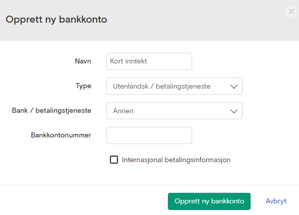 Mottar du kortbetalinger i Tidypay appen eller i TidypayGO nettbutikken må du legge inn en fiktiv bankkonto som disse innbetalingene vil bli registrert på. Kontoen opprettes under Foretak -> Bankkontoer. Bruk “Kort inntekt” som navn, velg “Utenlandsk / betalingstjeneste” for Type, og velg “Annen” i feltet for Bank / betalingstjeneste. Kontonummeret kan være et nummer du velger selv og skal ikke tilhøre en reell bankkonto.